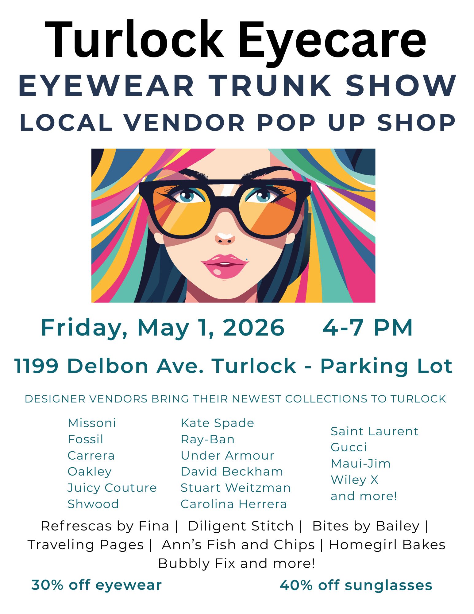 1199 Delbon Ave Ste 4 Turlock 1199 Delbon Ave. Ste. 4, Turlock, CA, United StatesJoin us for a night filled with designer eyewear and local vendors! Friday May 1st from 4-7 pm. Turlock Eyecare 1199 Delbon Ave Turlock - parking lot. We will have…